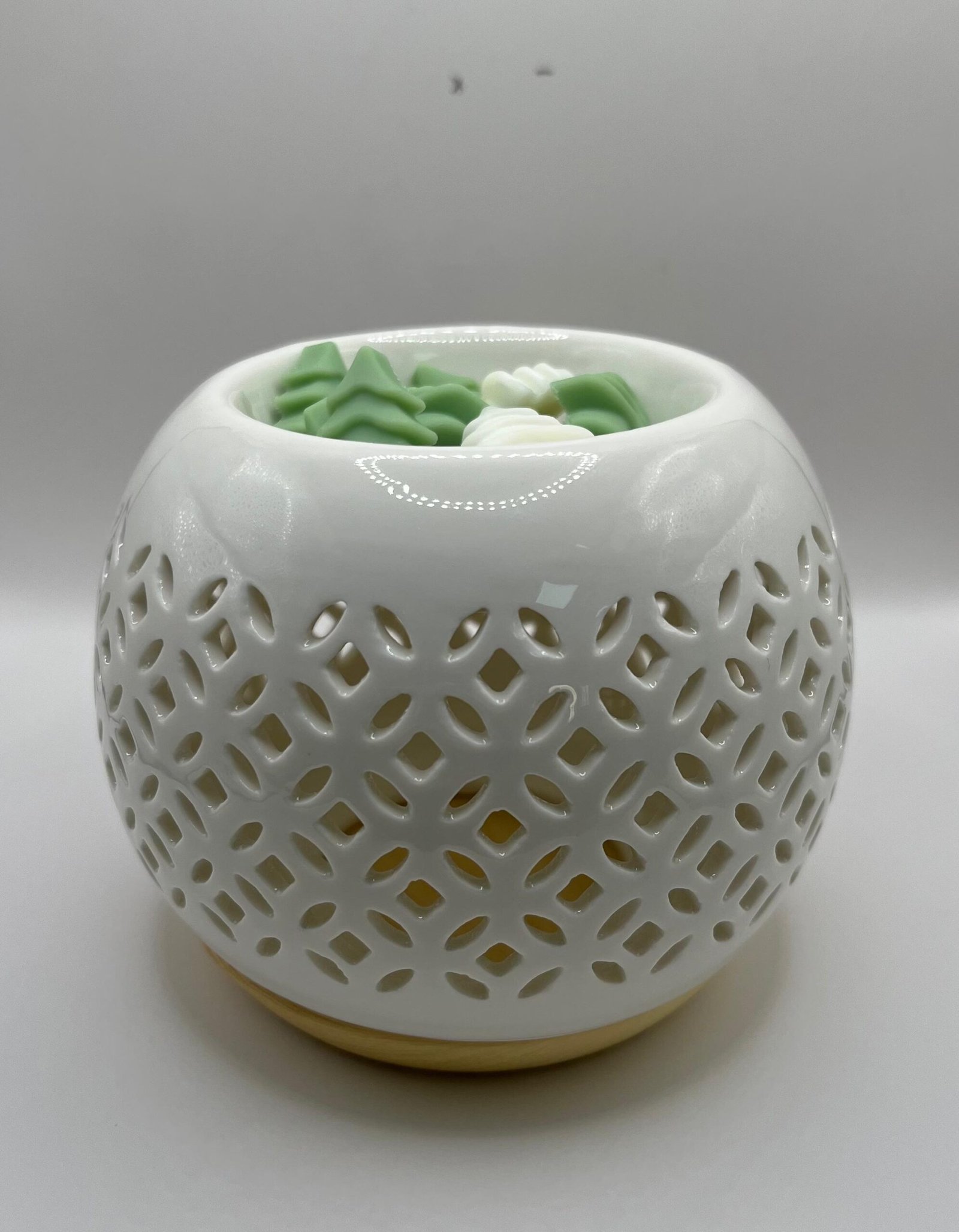 El Quemador de Cera Blanco Calado es un accesorio elegante y funcional diseñado para disfrutar al máximo de los wax melts y fragancias de hogar. Con su acabado en cerámica blanca y un delicado patrón calado, este quemador no solo difunde aromas de forma uniforme, sino que también proyecta una luz cálida y decorativa a través de sus aberturas, creando un ambiente acogedor y relajante.