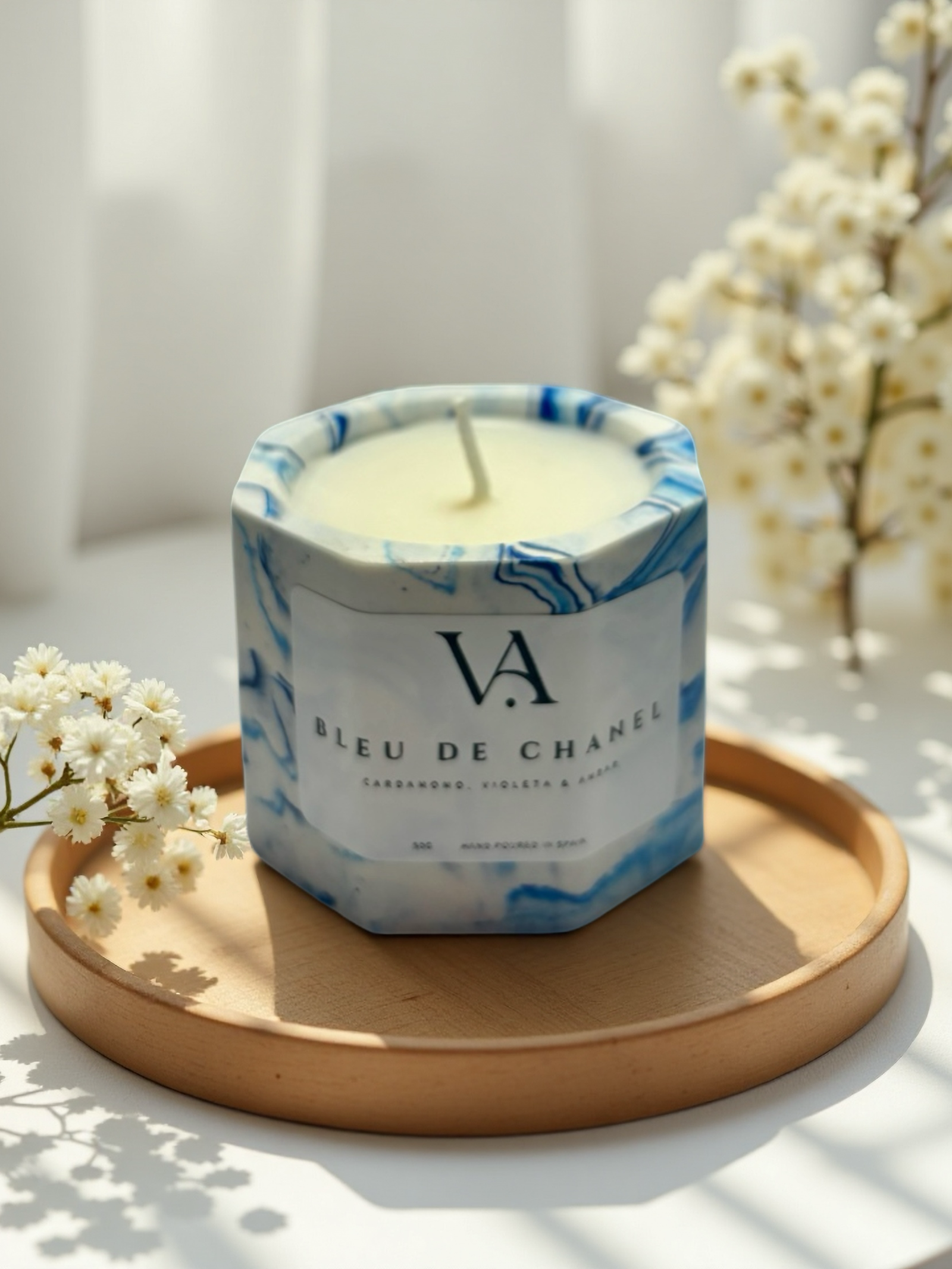 La vela Bleu es una fragancia con un perfil limpio y masculino, inspirada en las notas del perfume Bleu de Chanel. Es la opción perfecta para quienes buscan un aroma que aporte orden y frescura al hogar, combinando la salida especiada del cardamomo con un cuerpo de violeta y un fondo de ámbar.