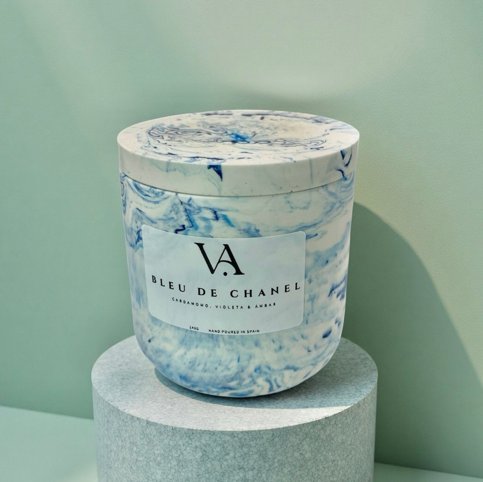 El envase de esta vela se fabrica a mano en nuestro taller utilizando jesmonite, un material mineral resistente y sostenible. El acabado marmolado azul se consigue de forma manual, por lo que cada veteado es distinto al anterior.